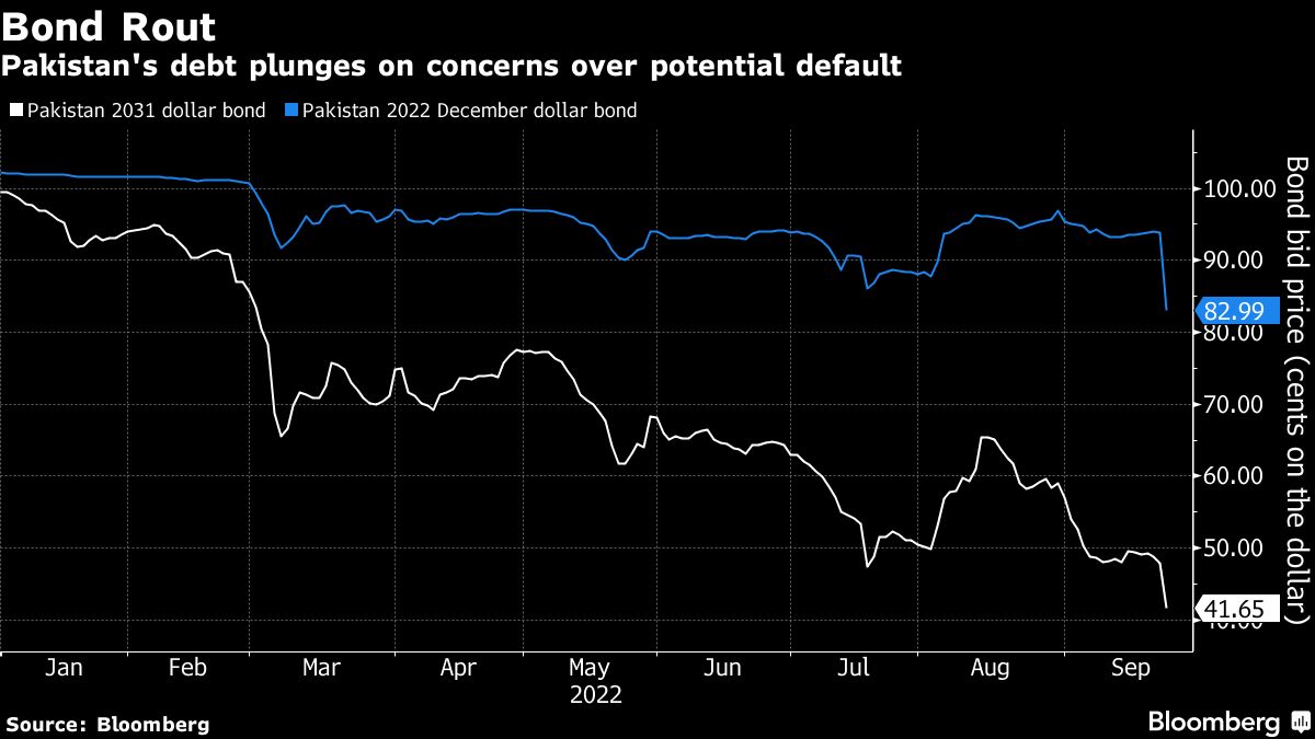 (Bloomberg) -- Pakistan's dollar bonds fell by the most on record after Prime Minister Shehbaz Sharif appealed to rich nations for debt relief as the country grapples with the aftermath of catastrophic floods.