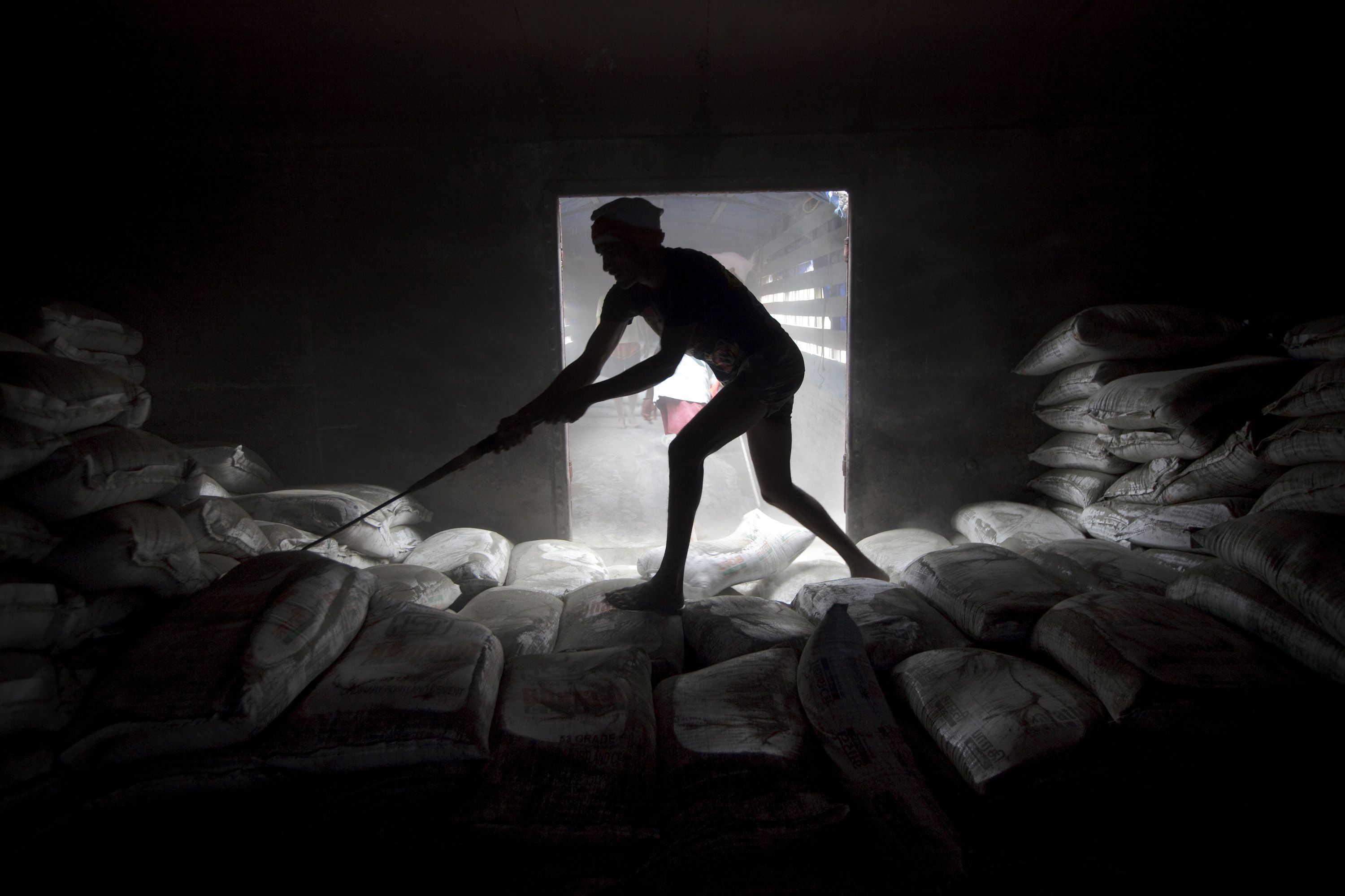 A worker unloads sacks of cement from a freight train in India. (Photographer: Kuni Takahashi/Bloomberg)