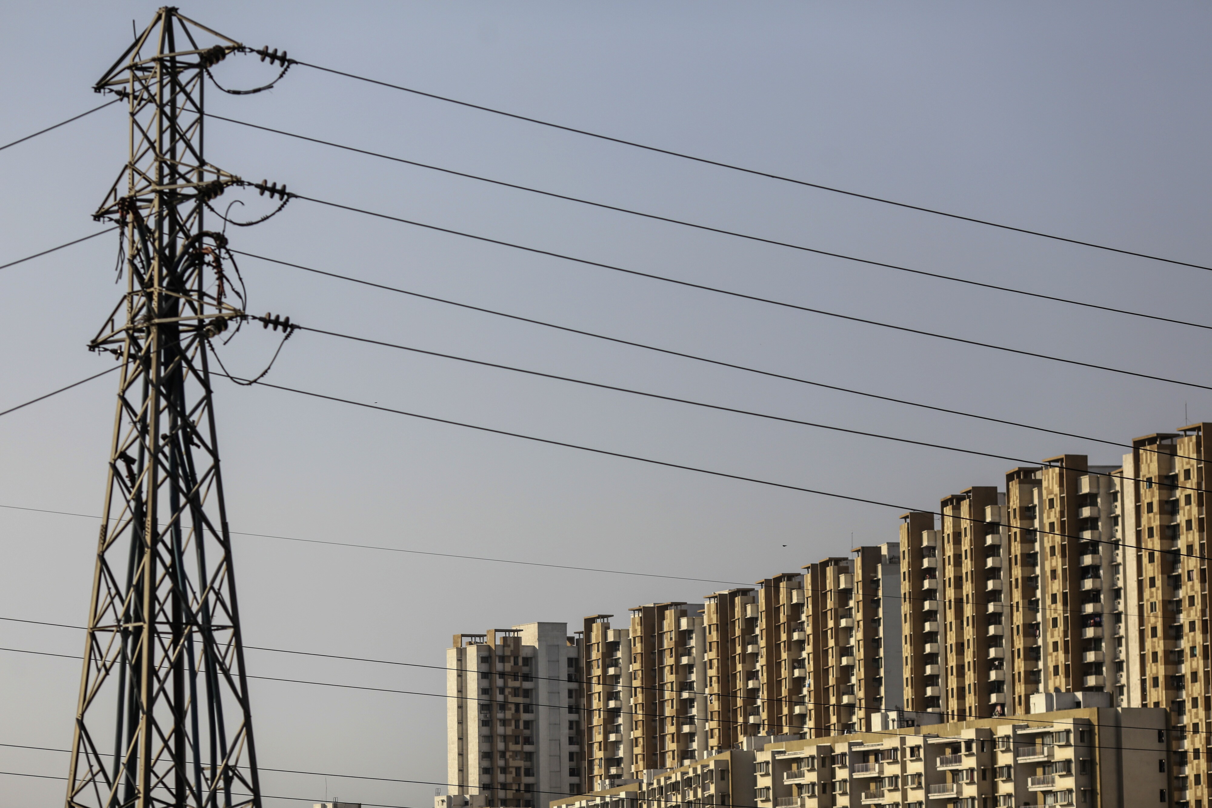 Residential apartment buildings stand beyond an electricity pylon in Palava City on the outskirts of Mumbai. (Photographer: Dhiraj Singh/Bloomberg)