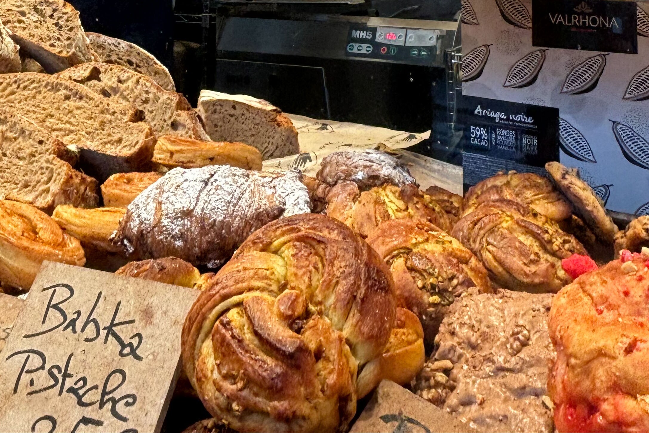 Croissant Tout Chocolat at Frappe Boulangerie Urbaine At this bright corner shop, owner Solenn le Squer was one of the first bakers in Paris to sell the round, glazed Supréme croissants that went viral in New York, but the item to order is the seasonally changing viennoiserie, or yeasted dough pastry. This winter she served a knockout one filled with rice pudding that was so creamy, it pooled out of the sides when the shell was cut. The current selection is a “croissant tout chocolat.” But unlike its close relative, pain au chocolat, with its plain pastry and rigid sticks of filling, the base here is a cocoa-infused dough with a voluptuous chocolate pastry cream in the center. A sprinkling of praline and sea salt chocolate crumbs gives it a final savory note. Soon, it will be replaced by a brand-new viennoiserie filled with strawberry preserves and cream.