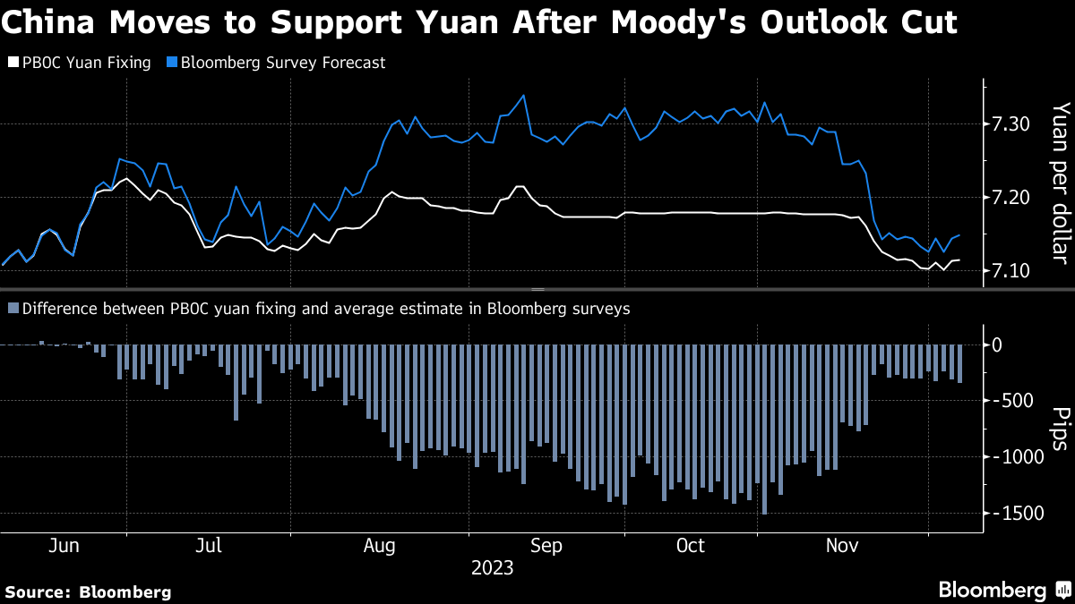 “Policymakers just want to keep up with the same messaging of wanting a steady yuan and not let Moody's derail the policymakers' efforts,” said Christopher Wong, strategist at Oversea Chinese Banking Corp. The market “can't rule out policymakers stepping in if there is excessive volatility in yuan.”