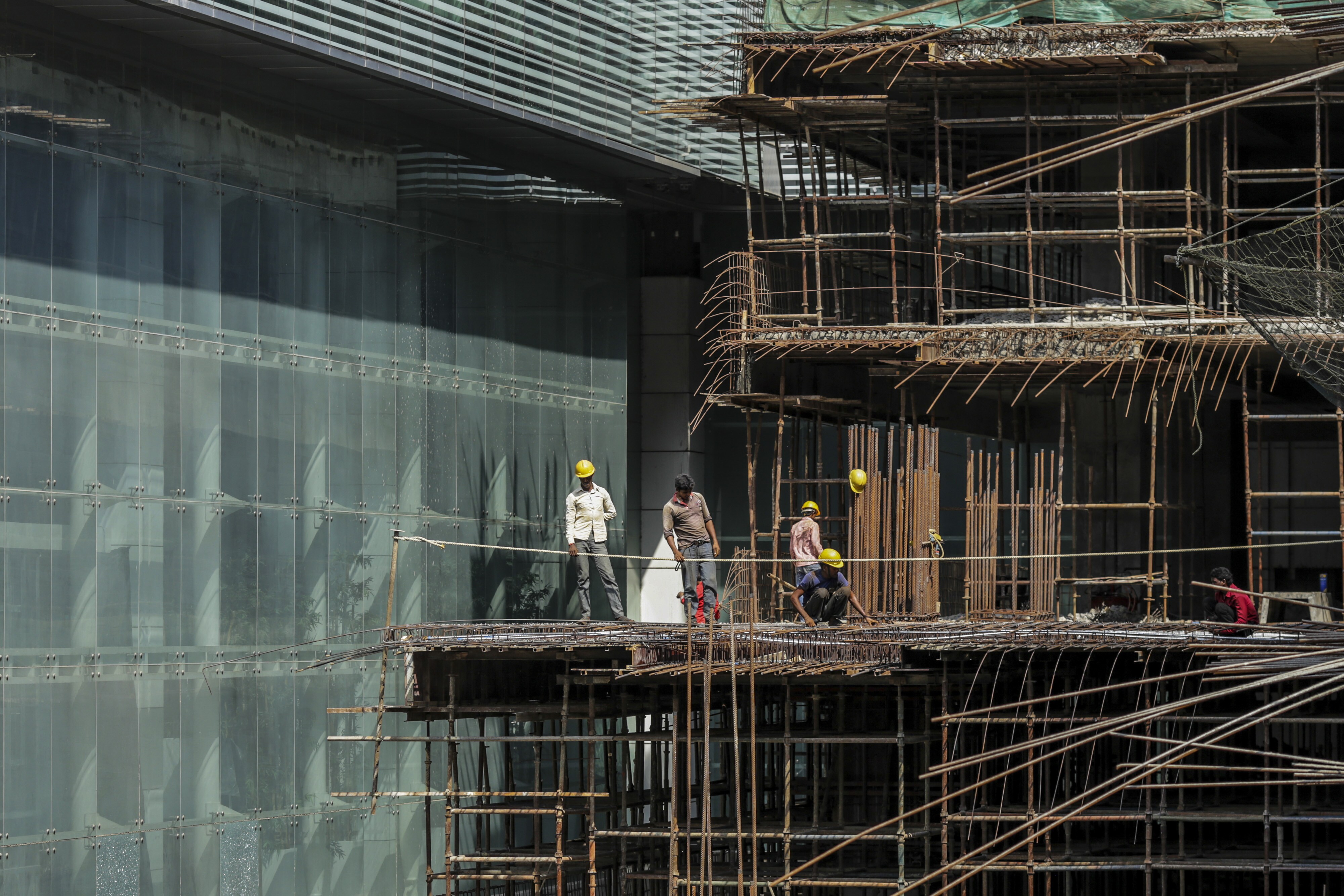 Labourers work on an Indiabulls Real Estate commercial building construction site in the Lower Parel area of Mumbai, India. (Photographer: Dhiraj Singh/Bloomberg)