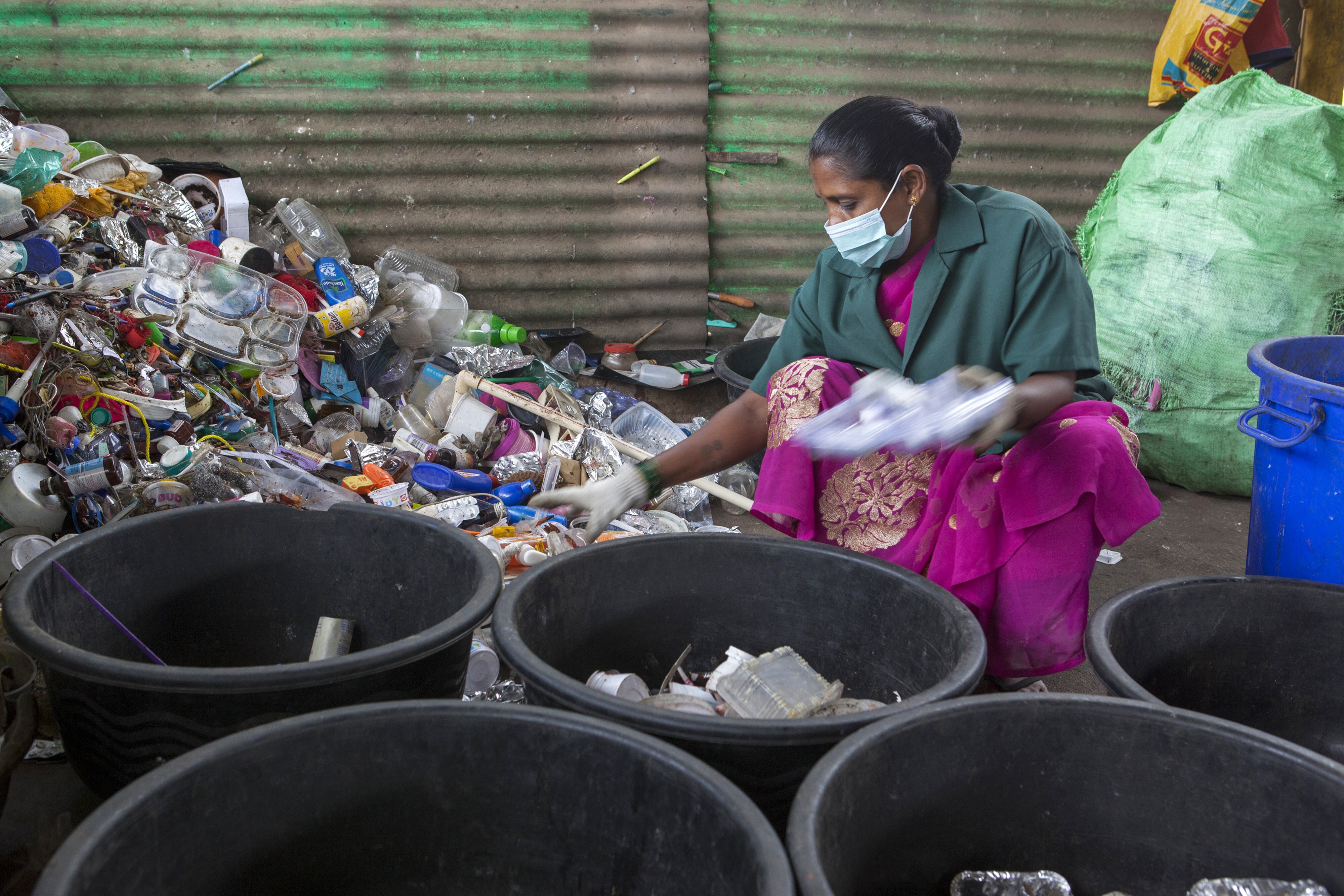 A worker sorts plastic household waste at a warehouse (Photographer: Samyukta Lakshmi/Bloomberg)