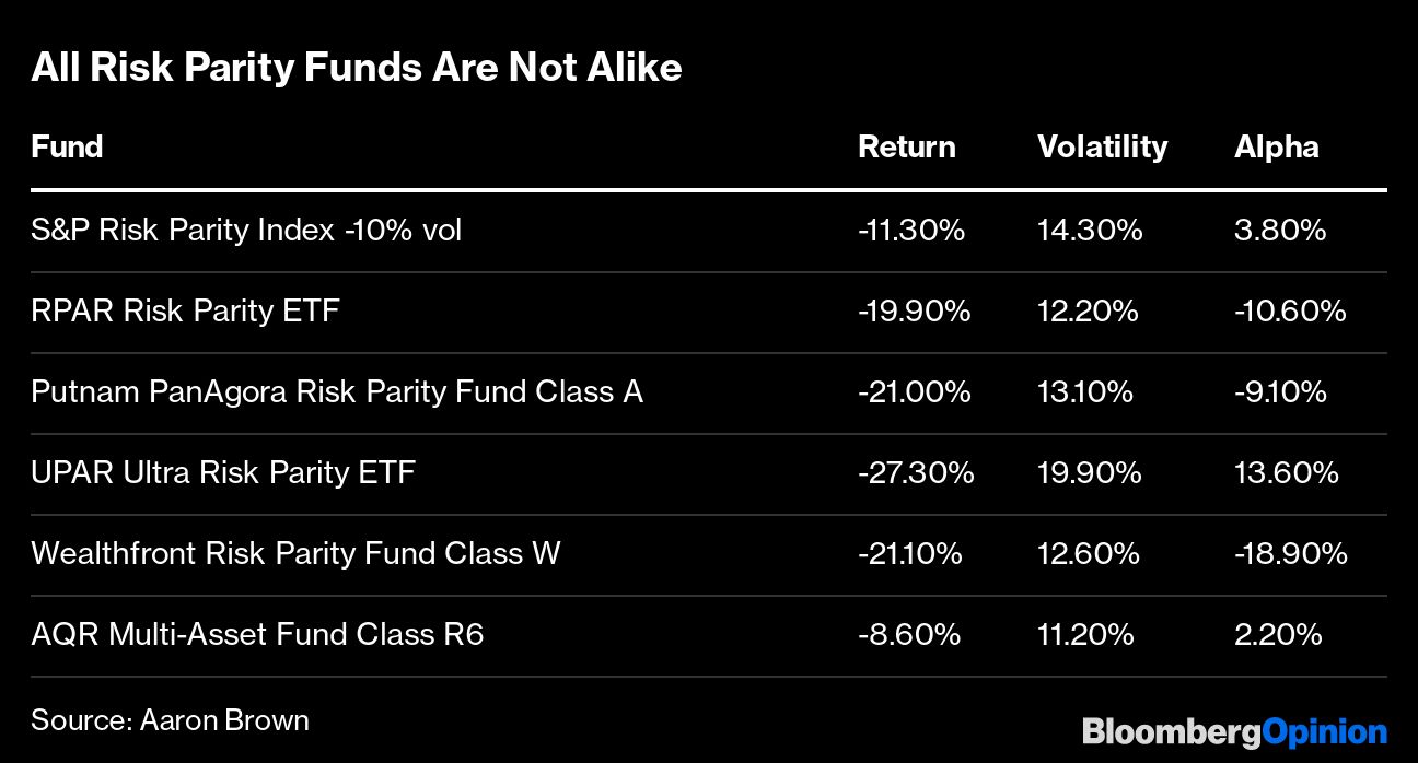 (Bloomberg Opinion) -- In times like these, when nothing seems to work in financial markets, risk parity strategies should act as a sort of shock absorber. It's a simple concept, really. Unless you have reason to believe one investment is better than another, you should take equal risk in each. That gives you maximum diversification, and diversification is still the only free lunch in finance.