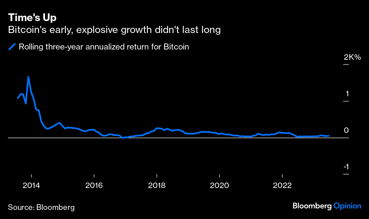 The Sharpe Ratio recognizes that volatility is just as important as return because the higher the volatility of an investment, the less likely it is that investors will hang around to capture the return. Nowhere is that truer than with Bitcoin. Indeed, Bitcoin's record since inception is largely irrelevant because few people bought it in 2010 and held it ever since; investors have more commonly dipped in and out along the way. Bitcoin's long-term record is no more useful to day-one investors because its pace of growth has slowed over time and will continue to as it matures.