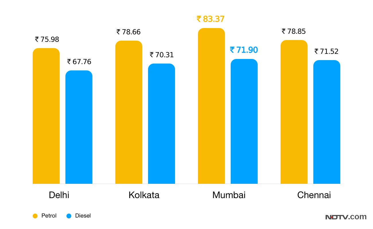 Oil marketing companies (IOC, HPCL and BPCL) on Saturday raised the prices of petrol, diesel again for the third day in a row. After the price hike, petrol prices now stand at Rs 75.98 in Delhi. In other three metro cities of Mumbai, Kolkata and Chennai, petrol prices stand at Rs 83.37, Rs 78.66 and Rs 78.85, respectively. Diesel is now sold for Rs 67.76 in Delhi on Saturday. In other cities of Mumbai, Kolkata and Chennai, diesel is sold to retail consumers for Rs 71.90, Rs 70.31 and 71.52, respectively. The fuel prices started rising from Thursday (July 5) after a gap of 36 days, during which the fuel rates were slashed.