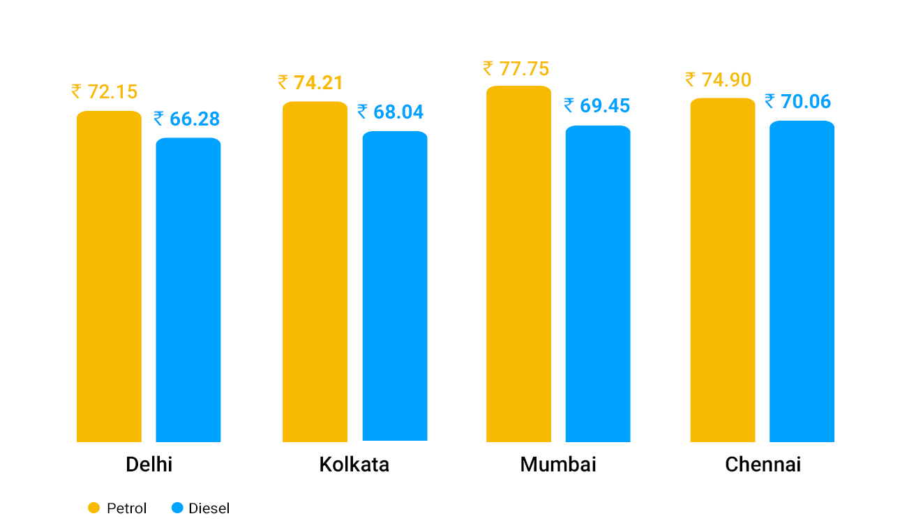 Diesel rates stood at Rs. 66.28 per litre in New Delhi, Rs. 68.04 per litre in Kolkata, Rs. 69.45 per litre in Mumbai and Rs. 70.06 per litre in Chennai. Diesel prices were decreased by 19 paise per litre in Delhi and Kolkata. In Mumbai and Chennai, the prices were cut by 20 paise per litre.