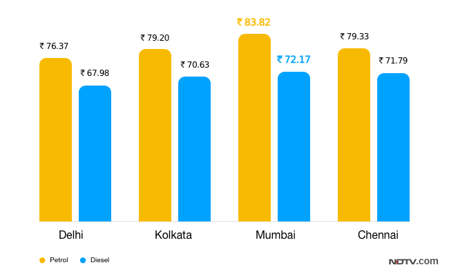 The above listed rates are applicable from 6 am. State-run oil marketing companies Indian Oil, Bharat Petroleum and Hindustan Petroleum revise fuel prices with effect from 6 am on a daily basis. Government allowed revision of fuel rates on a daily basis since mid-June last year to reflect changes in costs instantly.