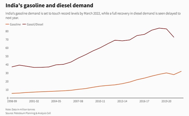 The stronger-than-expected petrol consumption growth could prompt Indian refiners to import the fuel or boost diesel exports in coming months. Indian refineries are traditionally configured to maximise production of diesel, where demand is still below pre-COVID levels, hurt by an uneven economic recovery