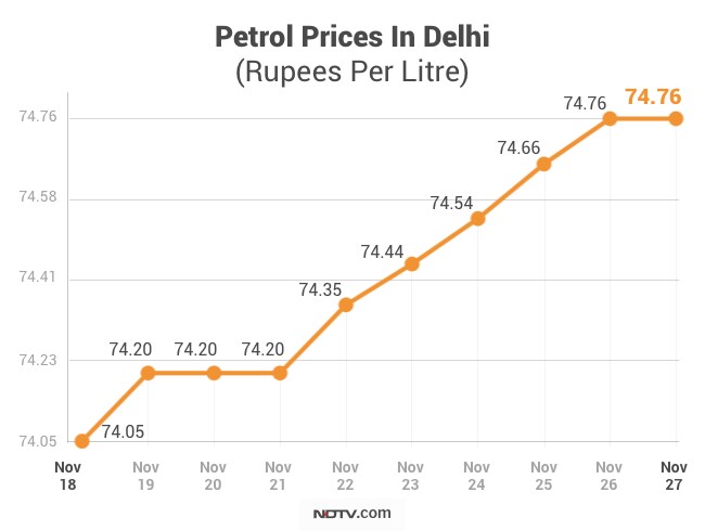 With effect from 6 am on Wednesday, November 27, the petrol price was at Rs 74.76 per litre and the diesel rate at Rs 65.73 per litre in Delhi, according to notifications from Indian Oil Corporation (IOC). The price of petrol had been hiked by 56 paise per litre in the national capital in the past five days.