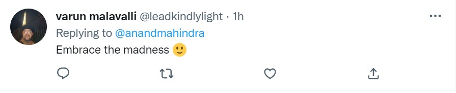 While sharing the picture, Mr Mahindra wrote a motivating caption that says, ‘You may be able to go in to work on Mondays with a smile on your face if you acknowledge inside yourself that the world's a madhouse & we're all a bit crazy. Just make sure you try to be ‘crazy good' at what you do…!'