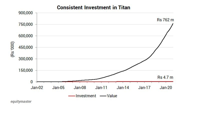 Even a tiny investment of Rs 1,000 per month in the stock of Titan, since 2002, would have led to mouth-watering returns.