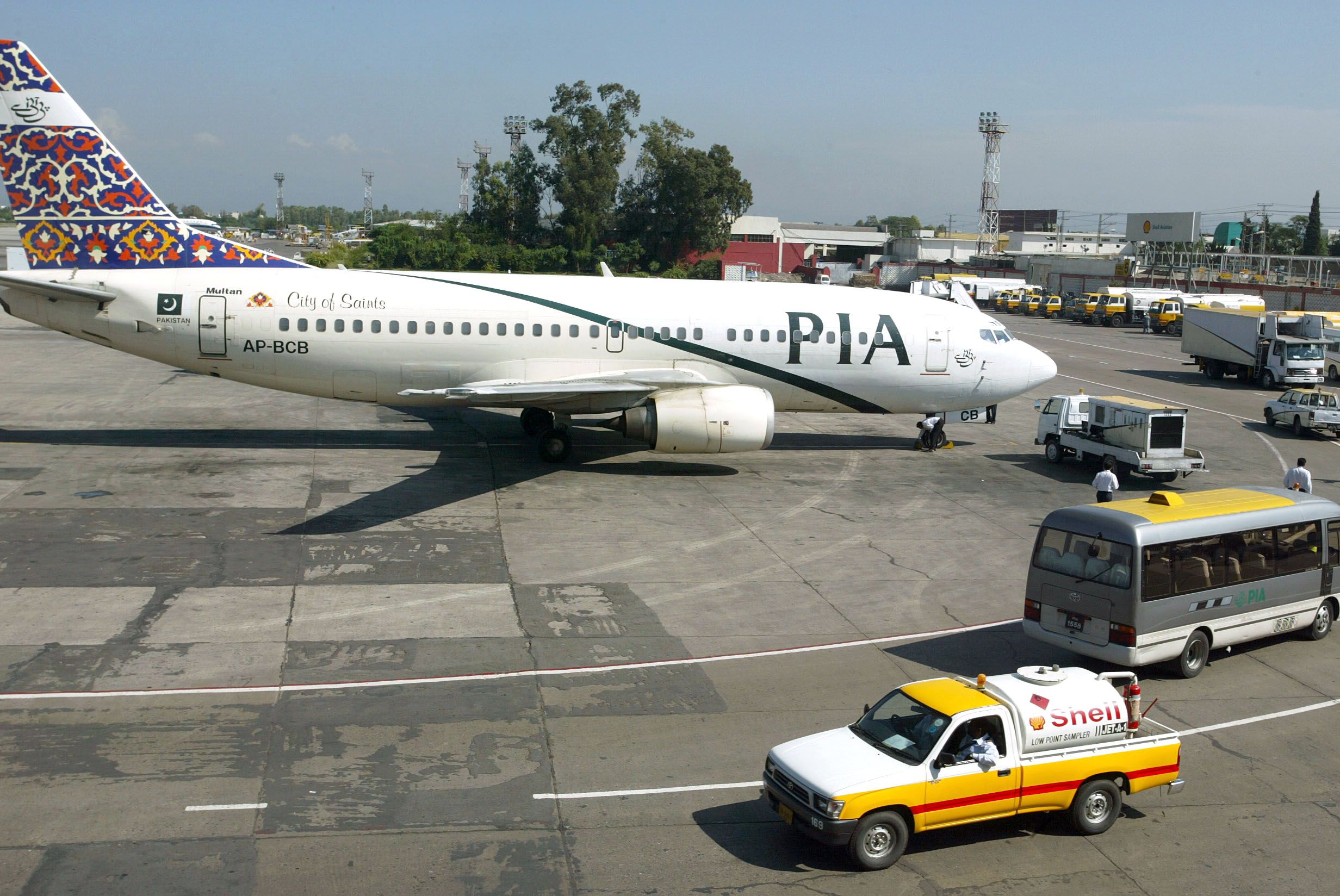 A Shell airplane refuel van drives past a Pakistan International Airlines jet in Islamabad International Airport, Pakistan. (Photographer: Simon Lim/Bloomberg News)