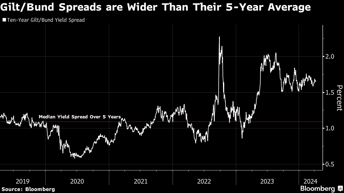 Yet yields on 10-year UK bonds are almost double the rate on their German equivalentsand the spread between them is much wider than their five-year average.