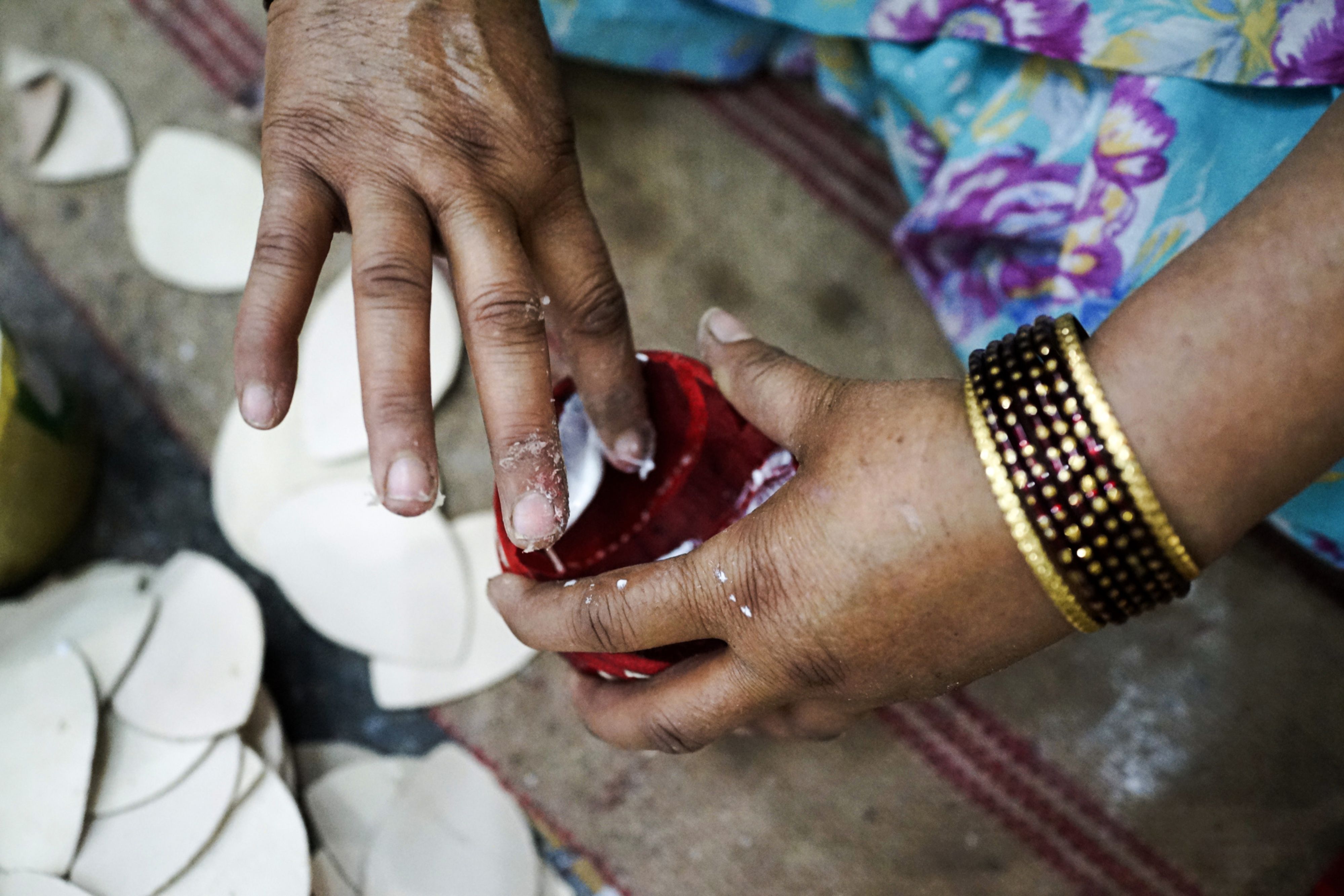 An employee applies glue to the leather casing of a cricket ball at a Stanford Cricket Industries factory in Meerut, Uttar Pradesh, India. (Photographer: Prashanth Vishwanathan/Bloomberg)