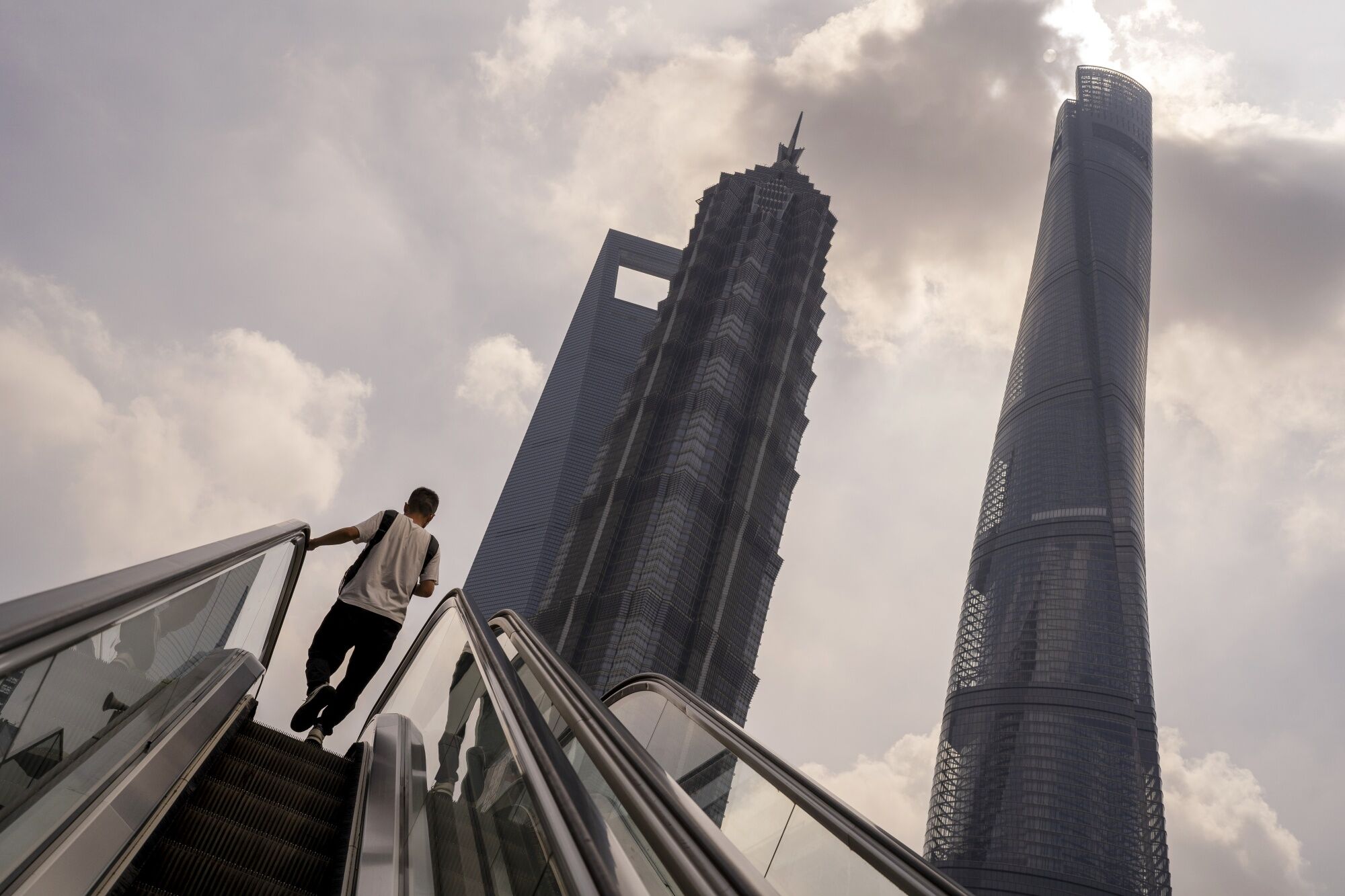 Pedestrians ride escalators in Pudong's Lujiazui Financial District in Shanghai, China, on Monday, Sept. 18, 2023. China's economy picked up steam in August as a summer travel boom and a heftier stimulus push boosted consumer spending and factory output, adding to nascent signs of stabilization. Photographer: Raul Ariano/Bloomberg
