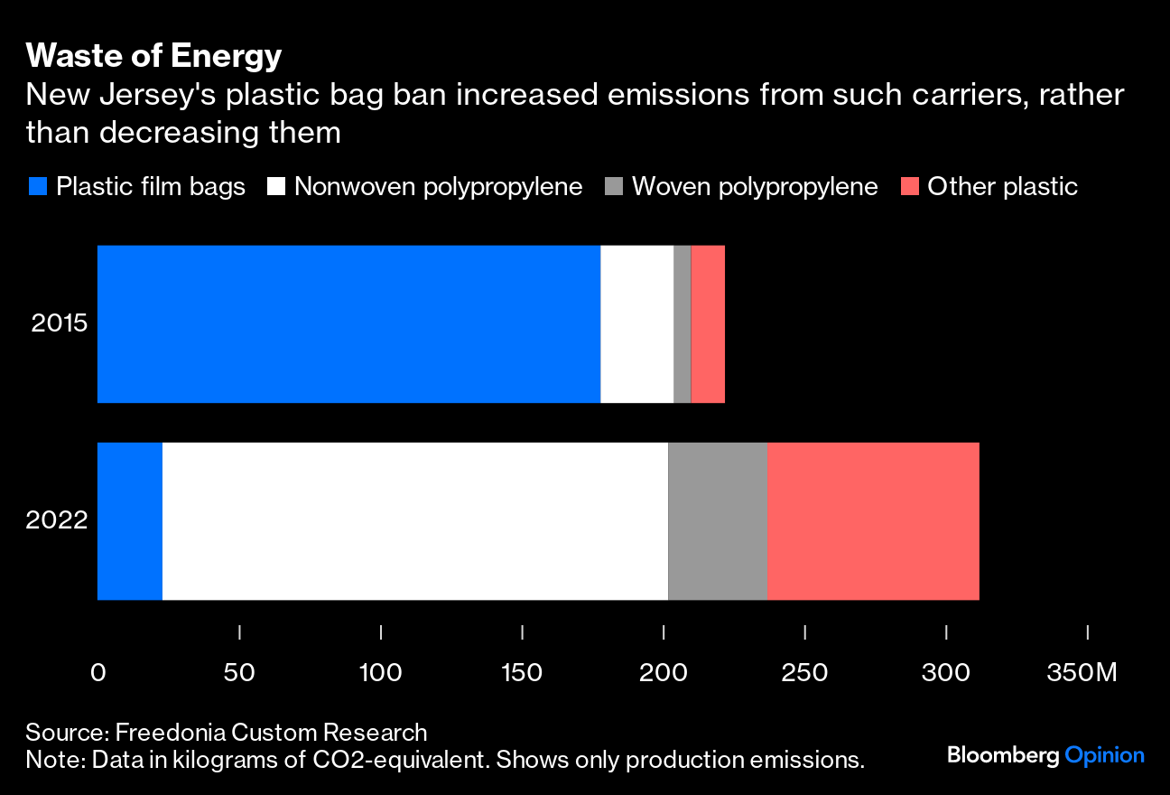 Far from reducing the consumption of polymers and the associated pollution, prohibiting single-use shopping sacks may well be increasing both problems. Usage of plastic for grocery bags in New Jersey increased threefold after a 2022 ban, according to a study earlier this month by Freedonia, a market research company, pushing the emissions used in manufacturing them up about 41%.