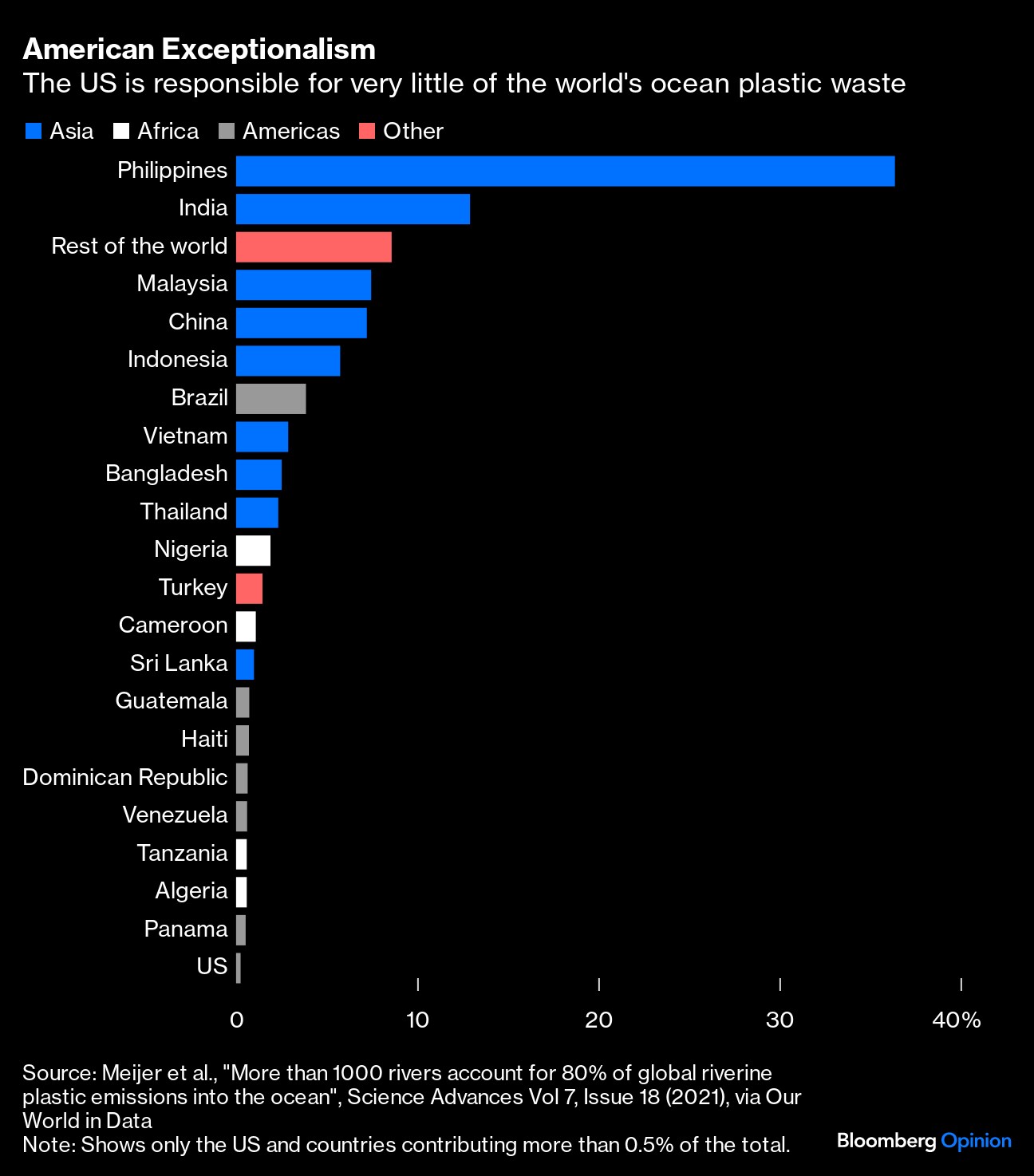 Hardly any of that detritus is attributable to the US, let alone New Jersey. Marine plastic mostly comes from short, fast-flowing rivers passing through large, middle-income cities that can't afford to manage their waste properly. About 81% of ocean polymers come from Asia, with more than a third emitted by the Philippines alone, according to a 2021 analysis. The US, at 0.25% of the total, is generating less marine litter than Panama or the Dominican Republic.