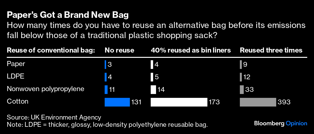 The evidence suggests it's not working out that way, however. You need to use a reusable plastic bag 52 times before its environmental impact drops below that of a disposable one, according to a 2018 study by the Danish government, rising to 20,000 times for organic cotton. (The numbers are lower if you look only at carbon pollution — paper sacks need to be reused three times, climbing to 11 times for non-woven polypropylene and 131 times for cotton, a UK government study found(1).)