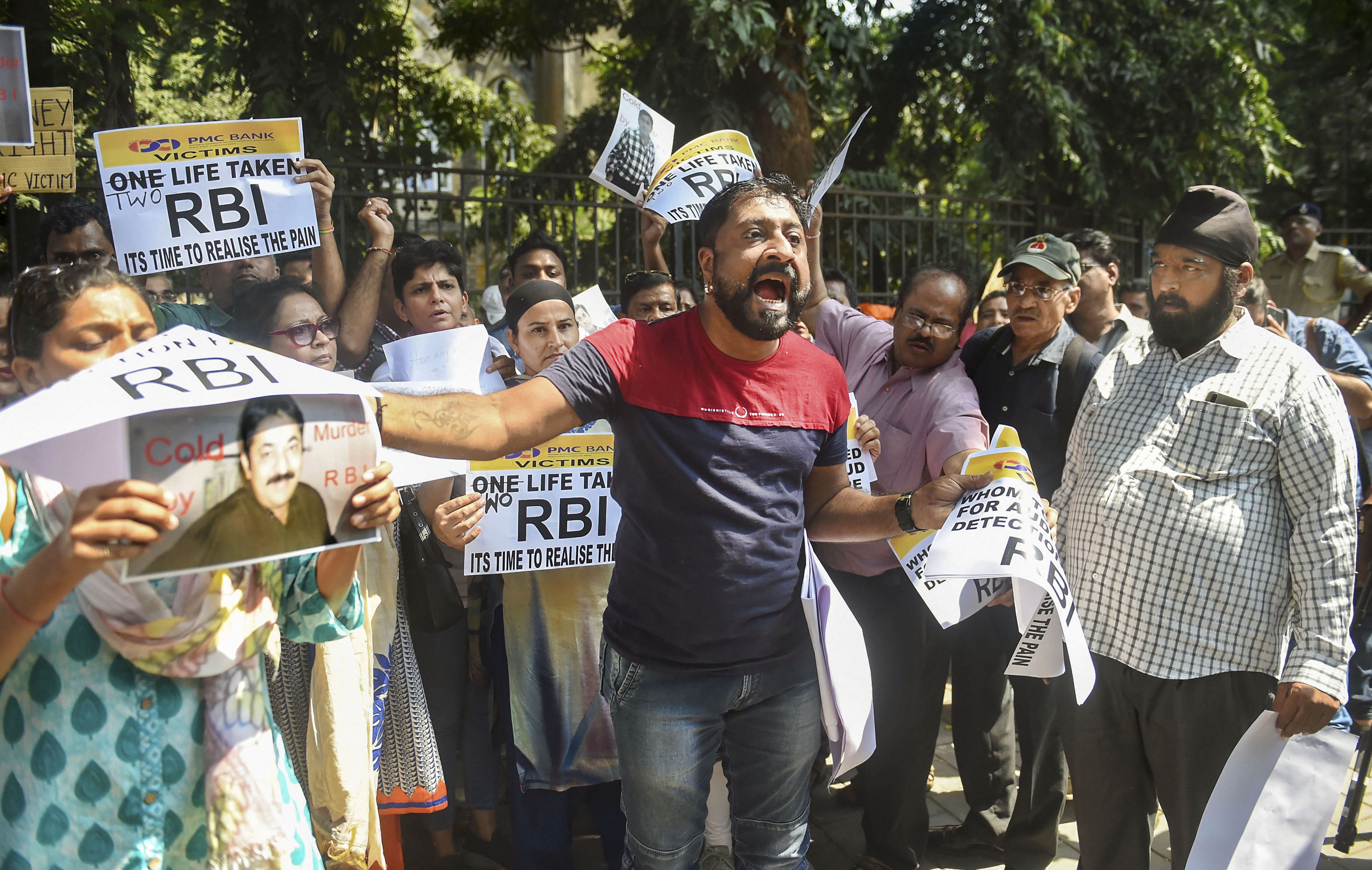 Depositors of the PMC Bank display placards and raise slogans during a protest over the Reserve Bank of India’s curb on the bank. (Source: PTI)