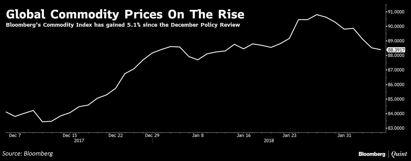 Since the MPC last met, global commodity prices have risen further. The Bloomberg Commodity Index, which constitutes of 22 commodities across the globe, has gone up 5.1 percent over this period. Higher commodity prices "pose a risk" to the fiscal position and inflation, Axis Bank said.