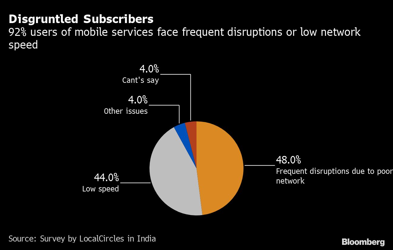 (Bloomberg) -- More than nine out of 10 mobile phone users in India complained of poor wireless connectivity, while two-thirds struggle with disrupted digital payments on older 3G and 4G networks, according to a local survey.