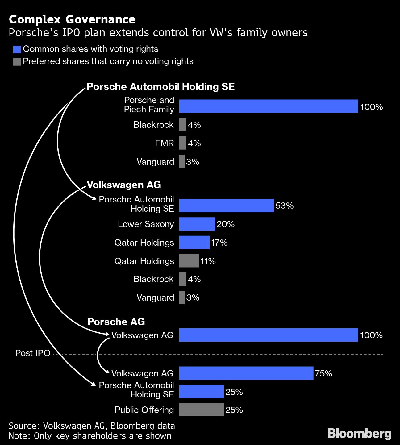 The listed Porsche will have a dual share structure similar to Volkswagen with voting and non-voting shares. Porsche's planned small free float and limited managerial independence -- Porsche head Oliver Blume will carry on as chief executive officer of VW -- has triggered governance concerns similar to criticism leveled at VW's convoluted structure.