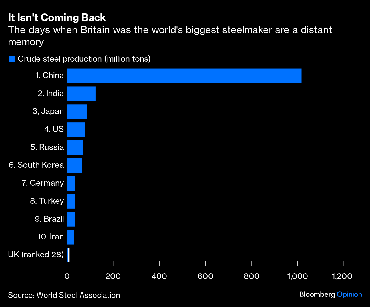 For an industry that accounts for 0.1% of UK economic output, the Port Talbot plan has generated an inordinate amount of outrage and resistance. This speaks to the emotional power of steel as a symbol of industrial might, the material that drove the Industrial Revolution and formed the backbone of bridges, railways, ships and machines. Britain made 40% of the world's steel in the late 19th century, having invented the process that enabled cheap mass production of the alloy. Now, China makes more than 35 times the UK's record production — every year. Each steel plant that closes or lays off employees in a British community is a reminder of that lost industrial leadership. But those days are gone, and aren't coming back.