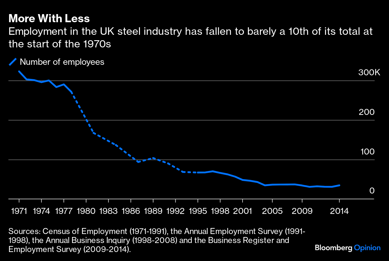The wider context here is of an industry that has been in decline for half a century, punctuated by periodic crises and under constant pressure to do more with less. Employment peaked at more than 320,000 at the start of the 1970s, and has since declined to barely a 10th of that. Steel production has also dropped, partly as a result of competition from newly industrializing countries where wages are significantly lower, but by a lesser magnitude, falling to around a fifth of its peak. On this measure, labor productivity has roughly doubled.