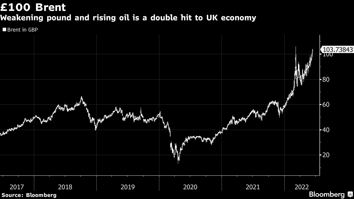 (Bloomberg) -- The jump in energy prices coupled with the fall in sterling today means a barrel of Brent crude is trading firmly above £100. With Thursday's Bank of England decision expected to do little to address the widening rates differential across the Atlantic, high energy prices will continue to dog the UK economy.