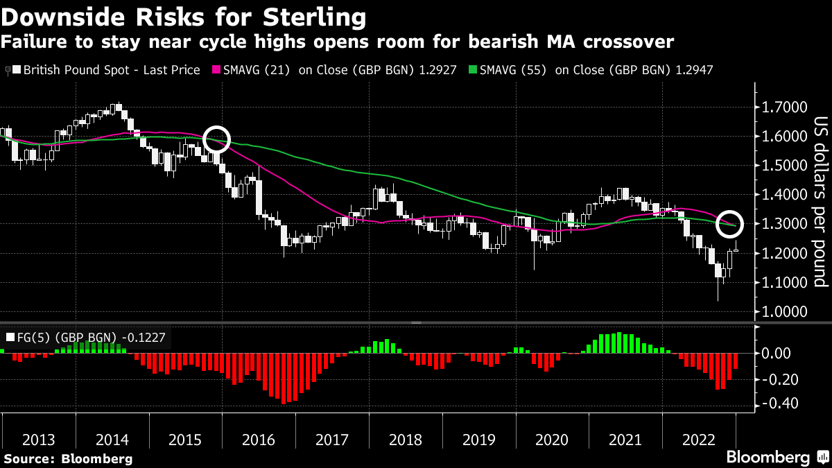 “The UK is in the vanguard of economies lurching into recession,” said John Hardy, head of FX strategy at Saxo Bank. “The combination of a heel-dragging BOE on further tightening and an austere fiscal picture could set up further declines” in the pound.