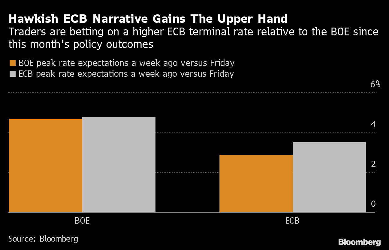 The pound can also weaken against other major currencies. Strategists at Rabobank, Commerzbank AG, and TD Securities see the euro strengthening to 0.90 pence as soon as June, compared to 0.88 now, as the European Central Bank amps up its rhetoric on the need for more rate hikes, a contrast to the BOE's more dovish stance.