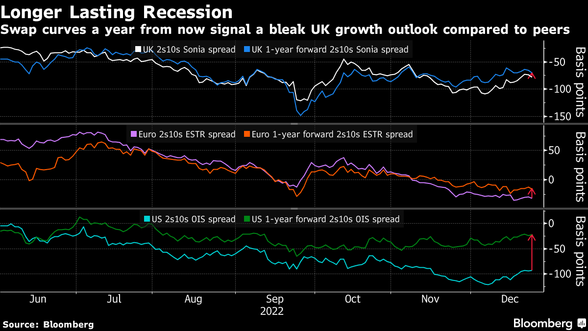Yield spreads between two- and 10-year swaps tied to the overnight rate—a gauge of recession risks—also point to a longer economic downturn in the UK than in its main peers. The difference between one-year forward and current spreads suggests yield curves in Europe and the US will steepen more than those in the UK.