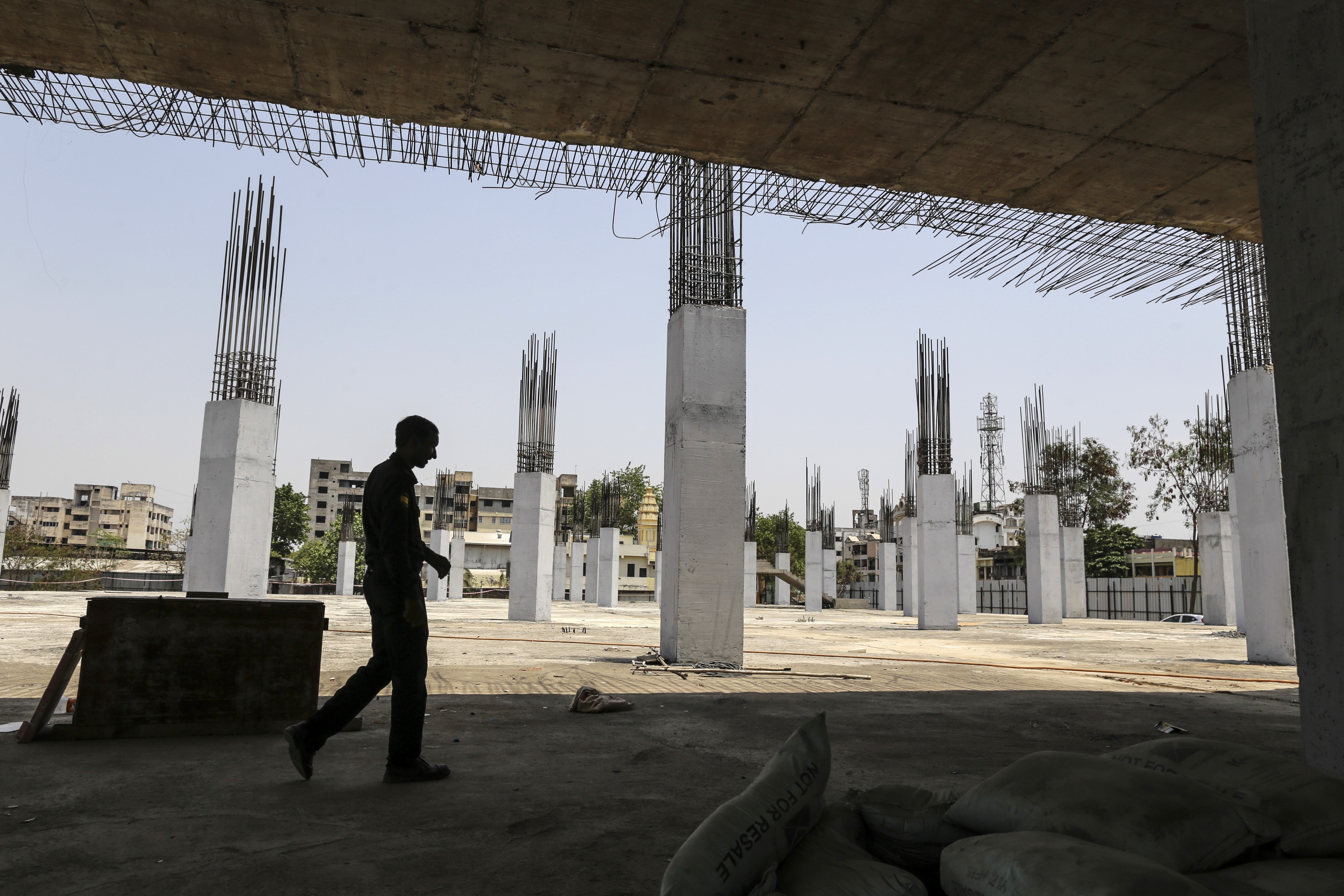 A man walks past reinforcing steel and concrete columns at the construction site of a wholesale market developed by Vishvaraj Infrastructure Ltd. in Nagpur, India. (Photographer: Dhiraj Singh/Bloomberg)