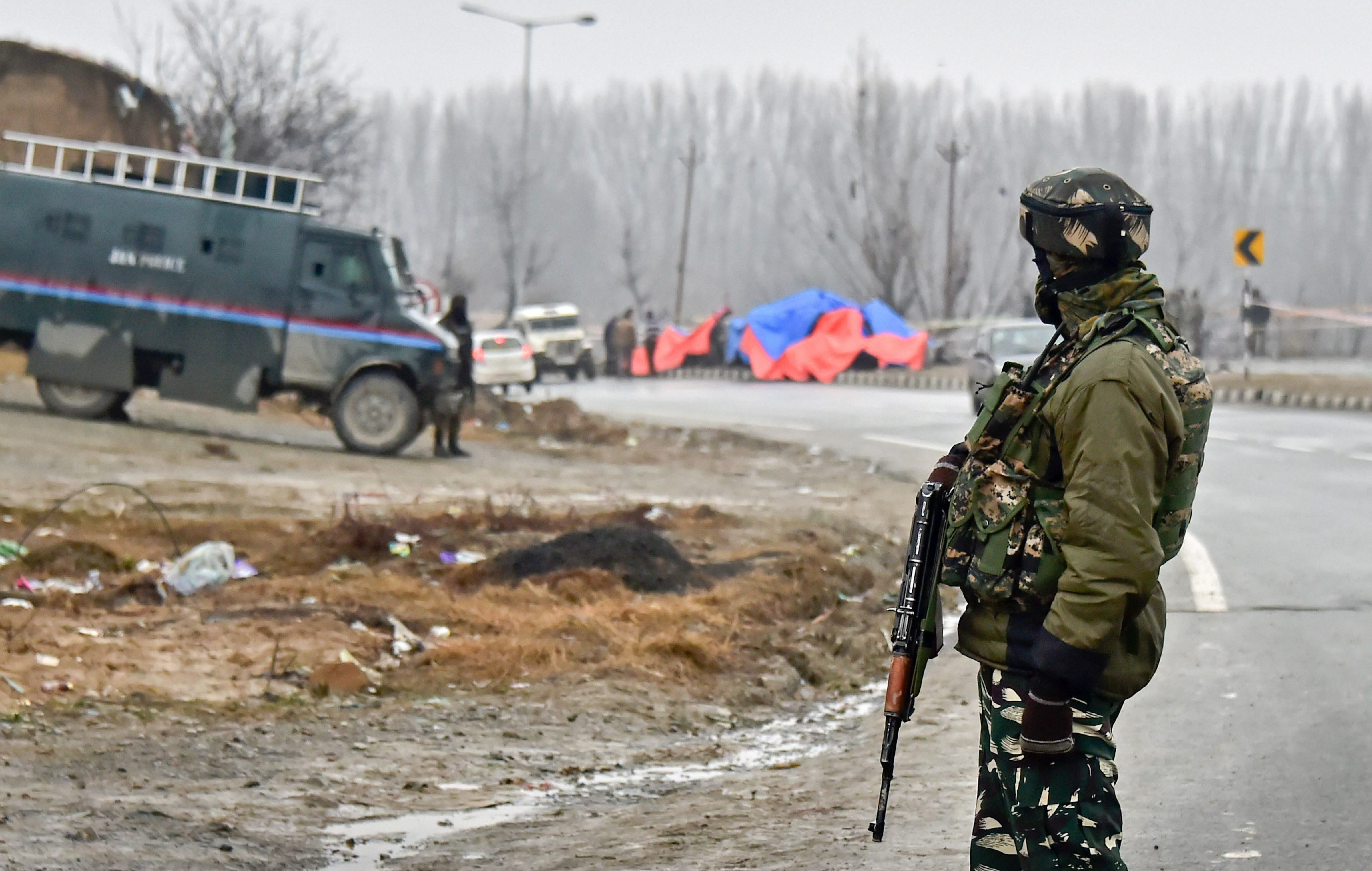 A security personnel stands guard at the site of the suicide bomb attack in Pulwama district of J&K, on Feb. 15, 2019. (Photograph: PTI)