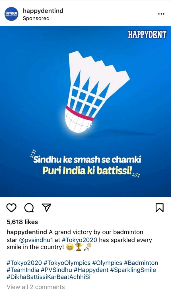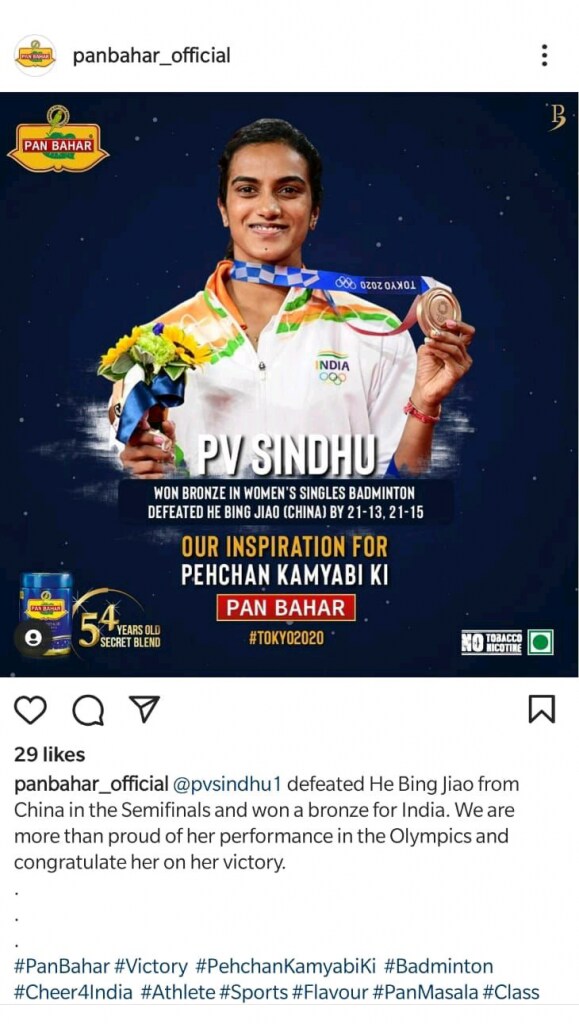 However, the messages above feature Sindhu's name (and in one case, image) next to the brand's name and logo displayed prominently, utilise the brand's colours (blue and white for Happydent, yellow for Pan Bahar), and even feature the brand's slogan or keyword used in their slogan ( ‘batti' for Happydent, ‘Pehchan Kamyabi Ki' for Pan Bahar).