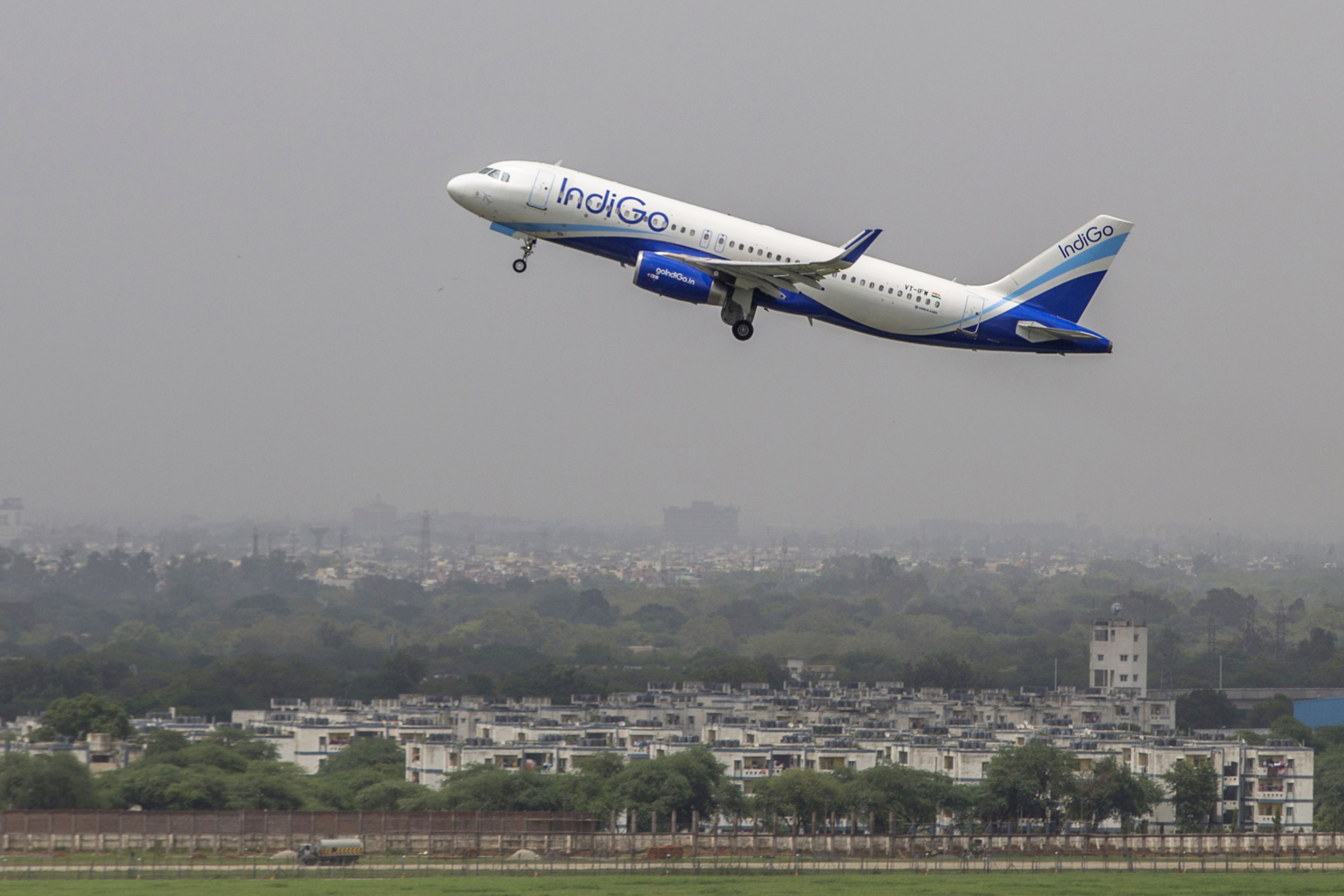 An aircraft operated by IndiGo, a unit of Interglobe Enterprises Ltd., is seen from a control tower as it takes off at Indira Gandhi International Airport (IGI) in Delhi, India. (Photographer: Prashanth Vishwanathan/Bloomberg)