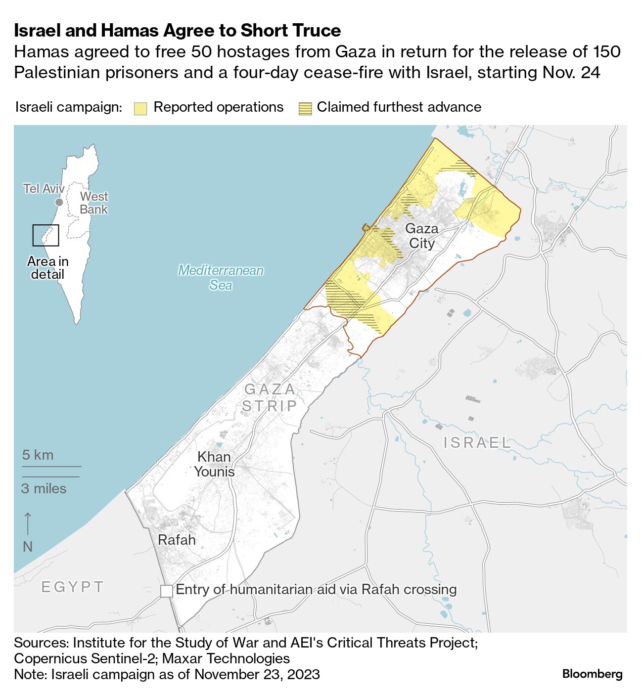 Israel has so far allowed more aid into Gaza and was set to release about 150 Palestinians from jail. Hamas, designated a terrorist group by the US and European Union, has so far freed more than 50 hostages, including foreigners.