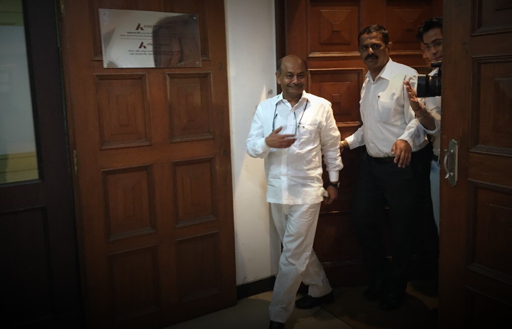Radhakishan Damani walks into the BSE ahead of the listing of Avenue Supermarts. (Photographer: Vijay Sartape/BloombergQuint)