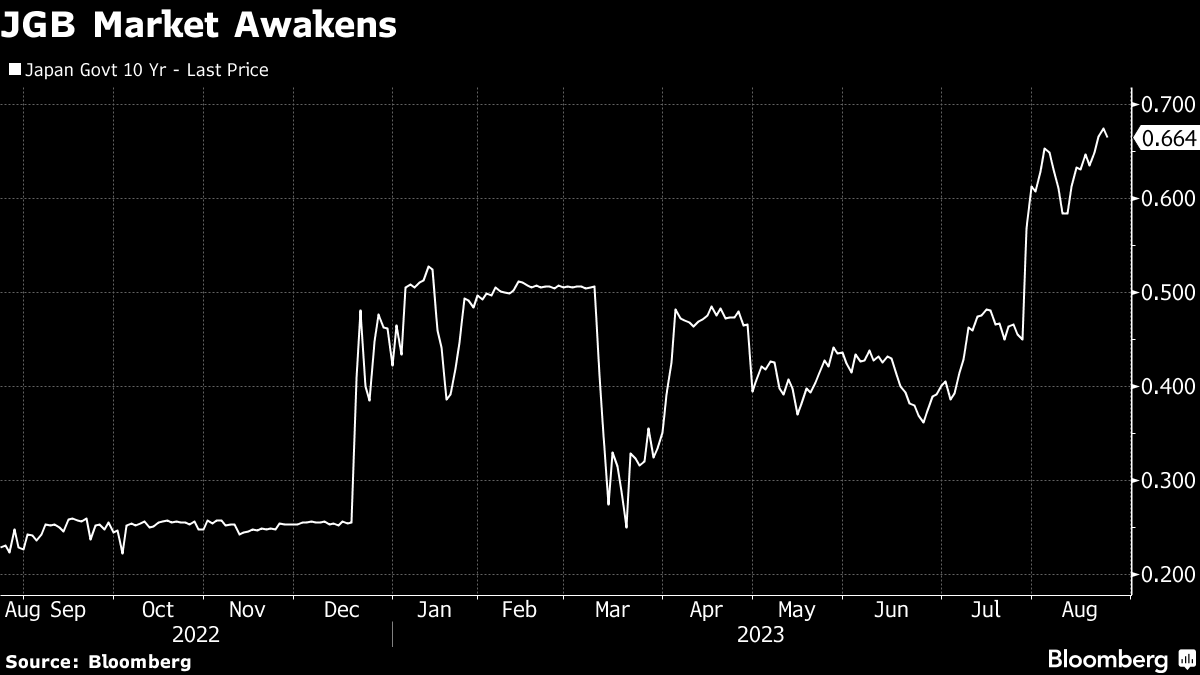 Japan's 10-year government bond yield reached the highest level since 2014 on Wednesday, hitting 0.675%. The BOJ's policy tweak allows it to rise to as high as 1%, although the central bank has been stepping into the market to control the pace.