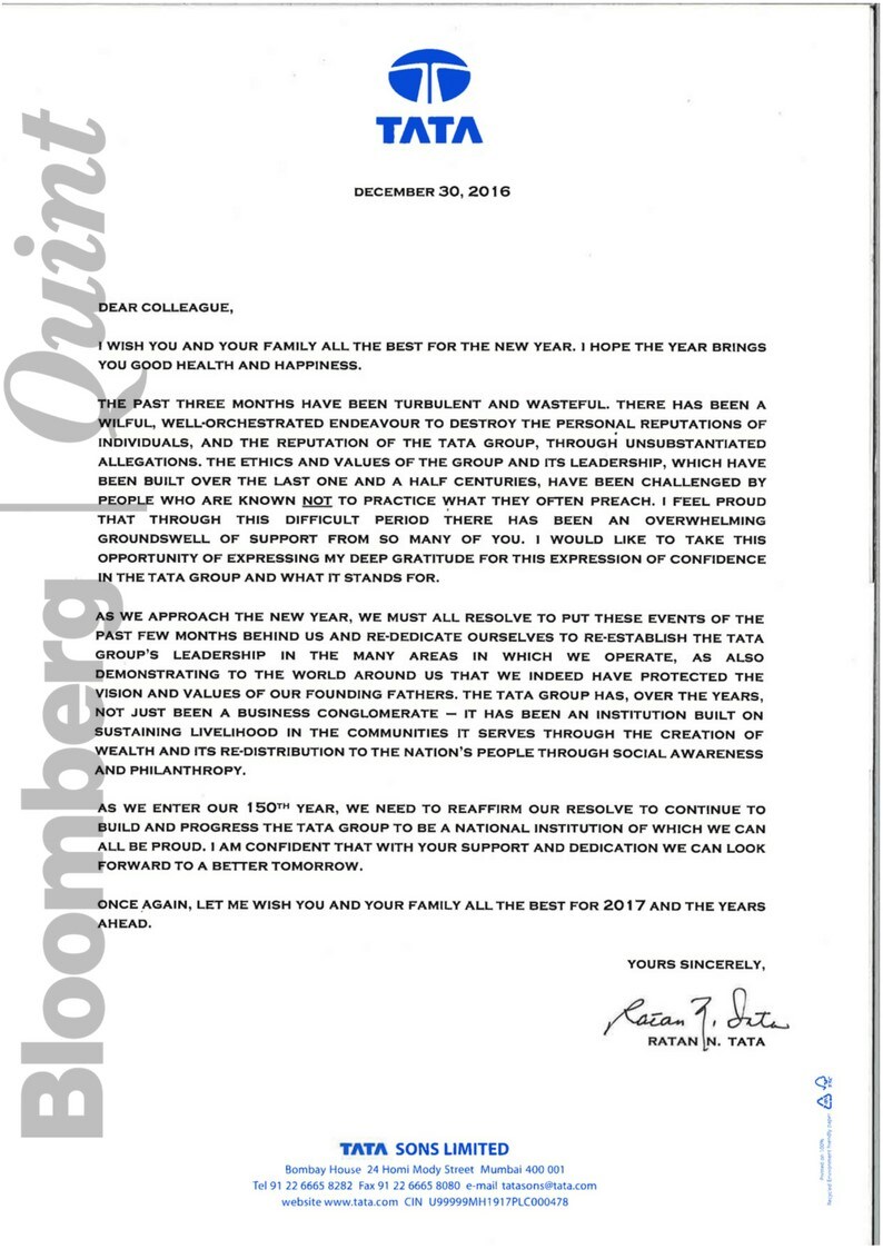 He has thanked all Tata group employees for the “groundswell of support” during this “difficult period”, in a letter on Friday.