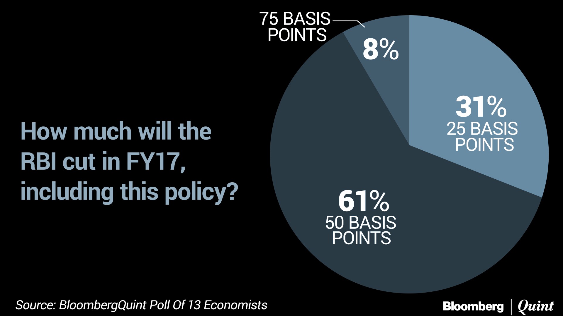 A majority of the 13 respondents (that is, 77 percent) in a BloombergQuint poll expect the RBI to reduce the policy rate by 25 basis points to 6 percent. A basis point is one hundredth of a percentage point. Only one respondent expects the RBI to cut the repo rate by 50 basis points, while the remaining 15 percent think the central bank will maintain a status quo.