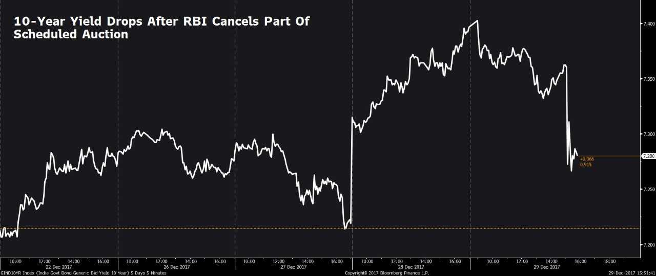The Reserve Bank of India on Friday cancelled part of the scheduled bond auction, signalling that yields have risen too far. The decision sent bond yields tumbling on the last trading day of the current calendar year.