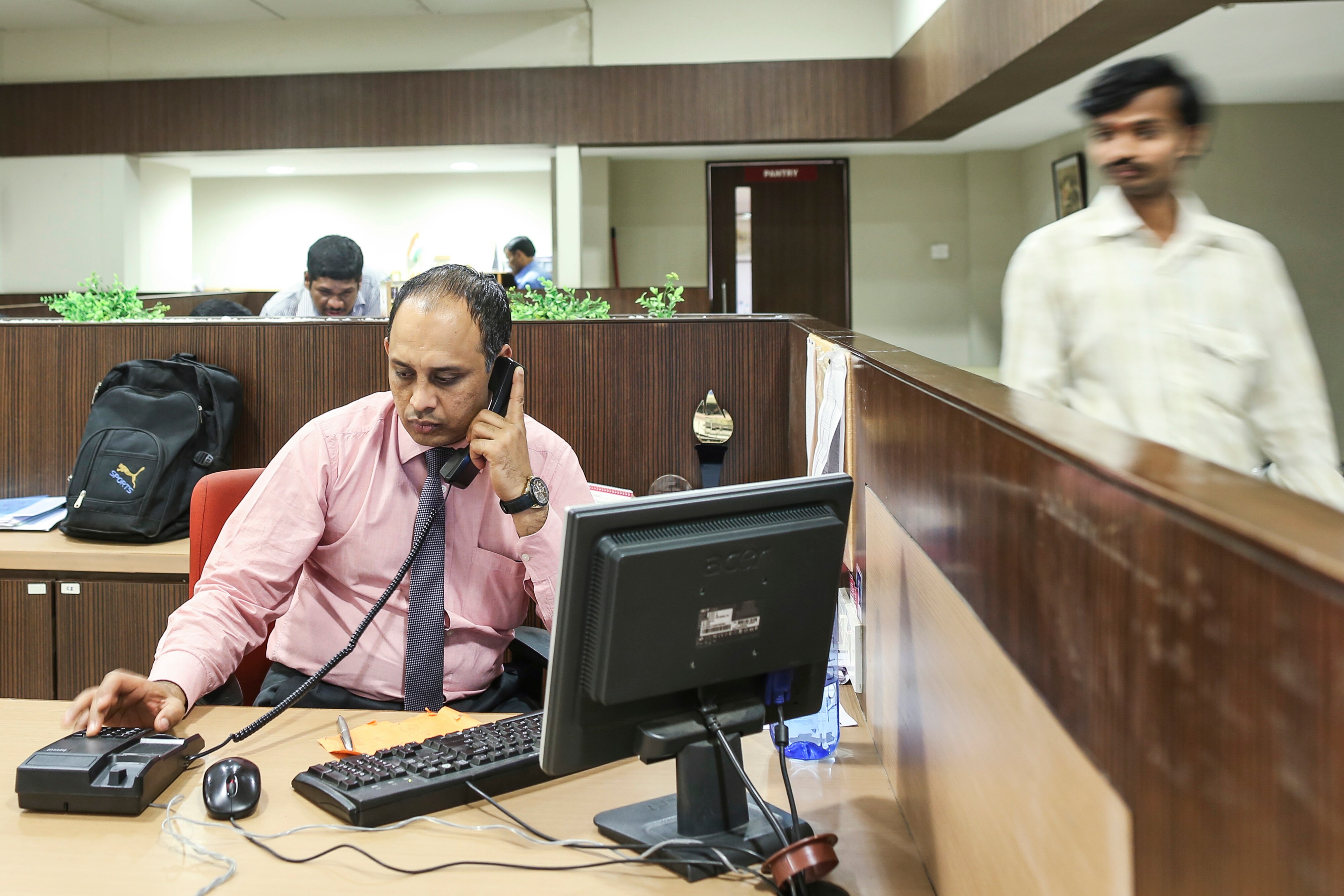 An employee talks on the phone as a customer walks past inside a bank branch in Mumbai, India (Photographer: Dhiraj Singh/Bloomberg)