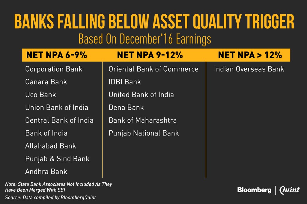 Data collated by BloombergQuint based on December 2016 earnings had shown that at least 16 public sector banks will be forced to take specific measures in the current fiscal to correct their performance.