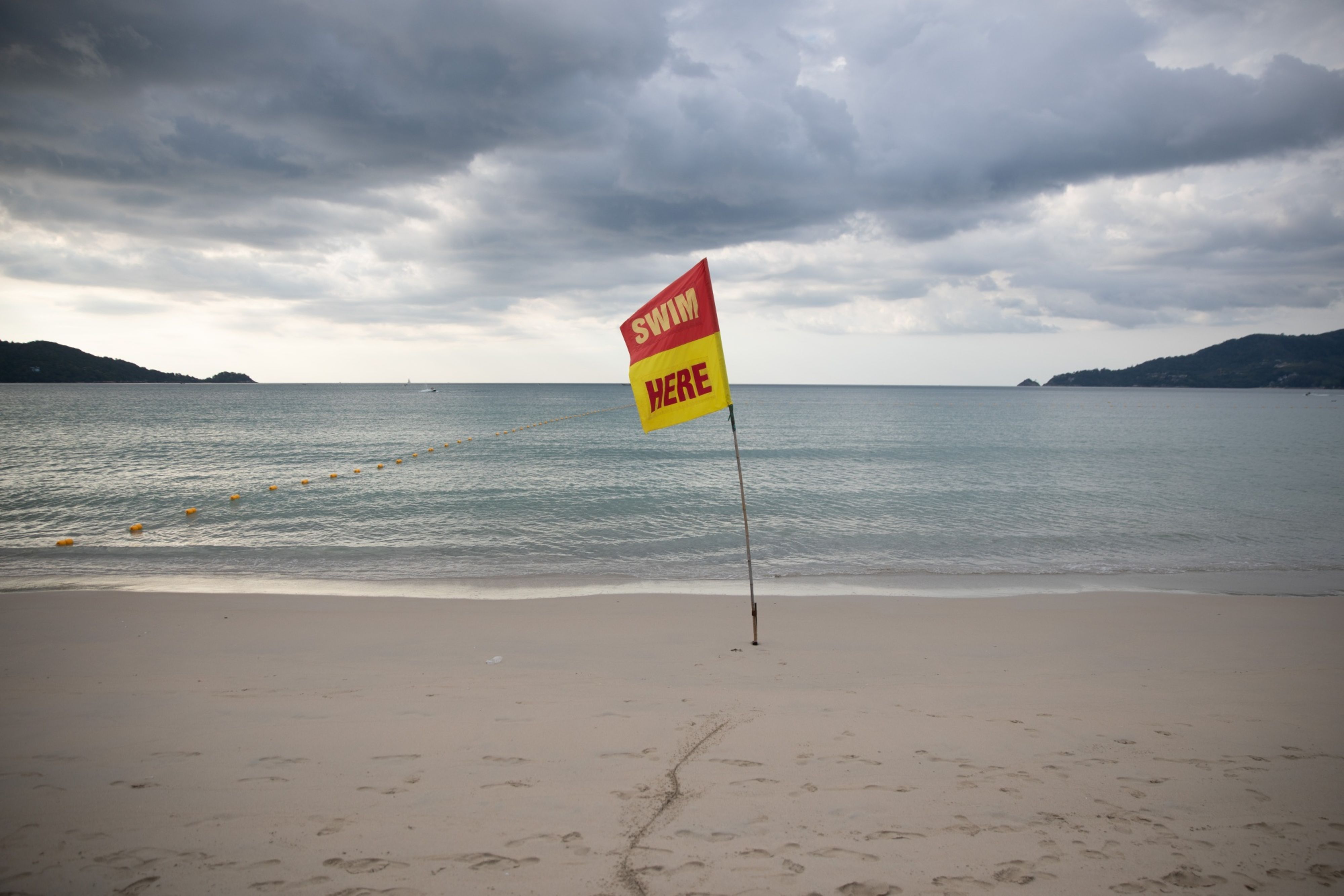 A swimming sign on a deserted beach. [Photographer: Taylor Weidman/Bloomberg]