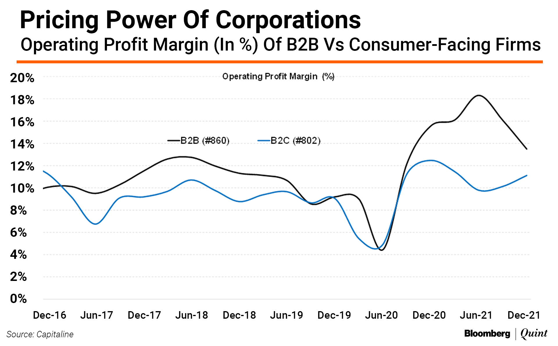 Another relevant proxy of the output gap is the operating profit margins of companies. This metric is broader in scope and captures likely demand conditions in both manufacturing and consumption, basis the ability of manufacturers to pass on higher input costs to end-consumer product prices.
