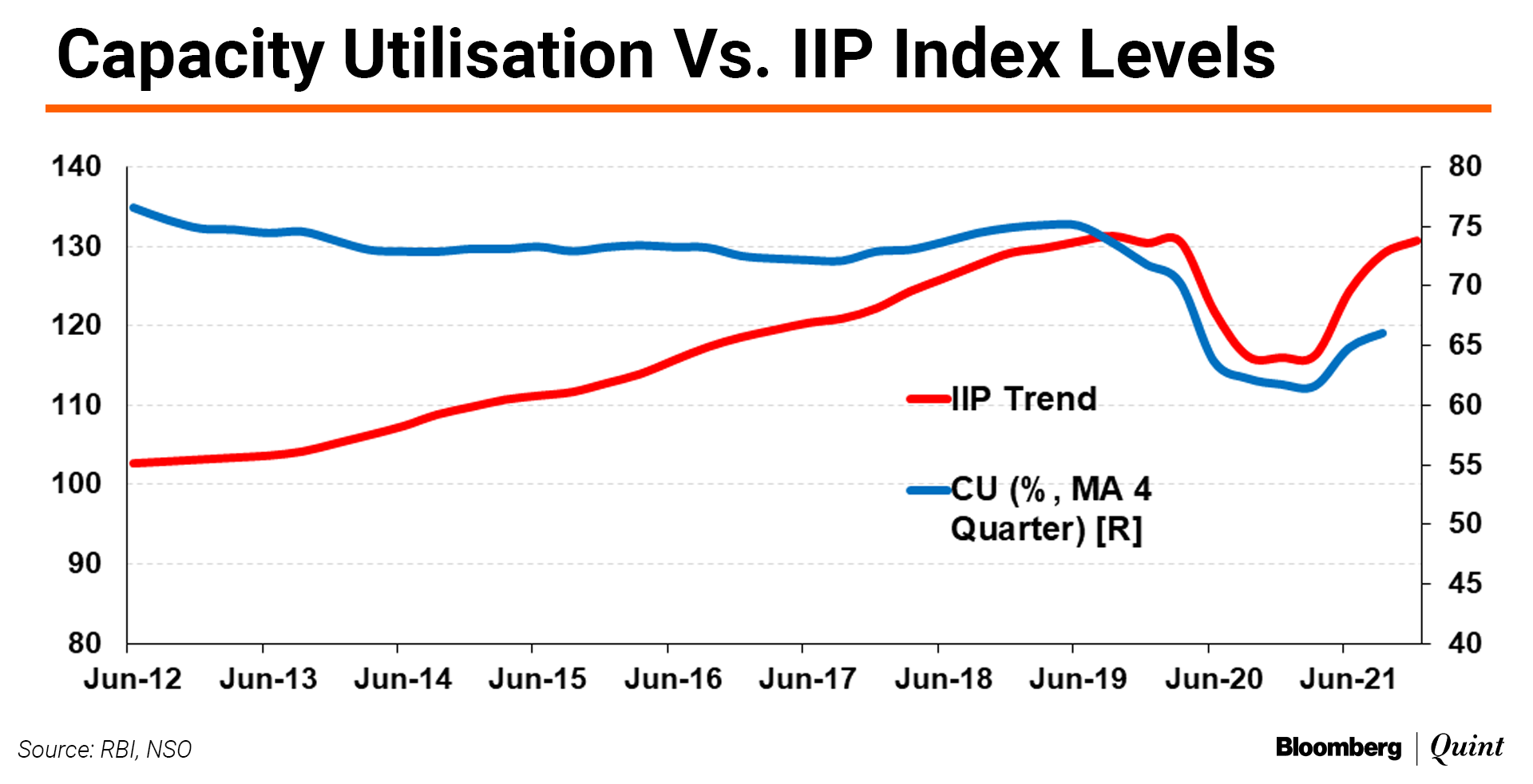 The first and obvious indicator of the output gap—in manufacturing—is capacity utilisation levels. The most definitive measure is from RBI surveys, and the last reading of September 2021 showed capacity utilisation improve to 68% from 60% in June 2021. The first chart shows the co-movement of utilisation with the Index of Industrial Production.