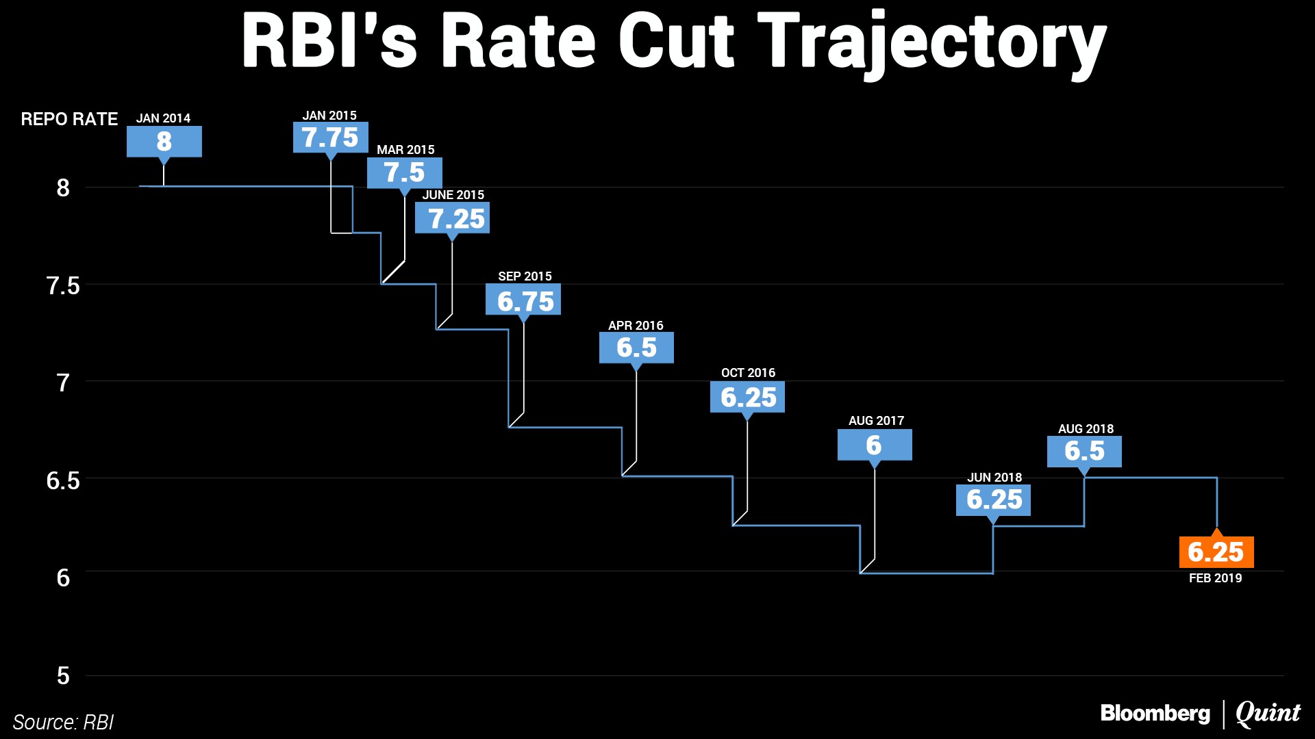This is the first rate cut announced by the MPC since August 2017 and marks a reversal in the rate cycle. Over the course of 2018, the MPC had raised rates twice by a total of 50 basis points to 6.5 percent. In October, it changed the policy stance to ‘calibrated tightening' from neutral fearing that elevated core inflation poses upside risks to headline inflation.
