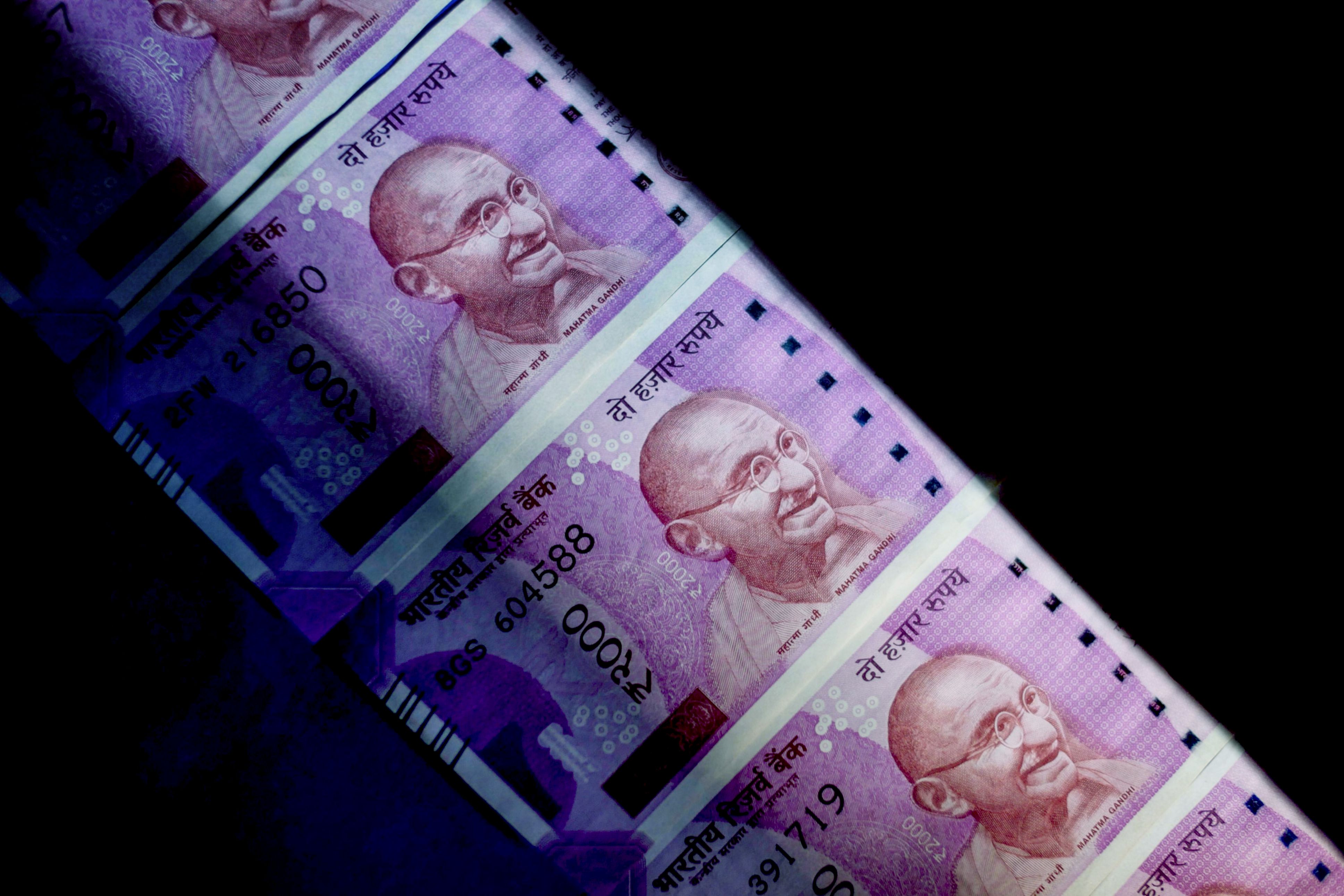 Indian two thousand rupee banknotes are arranged for a photograph in Mumbai. (Photographer: Dhiraj Singh/Bloomberg)